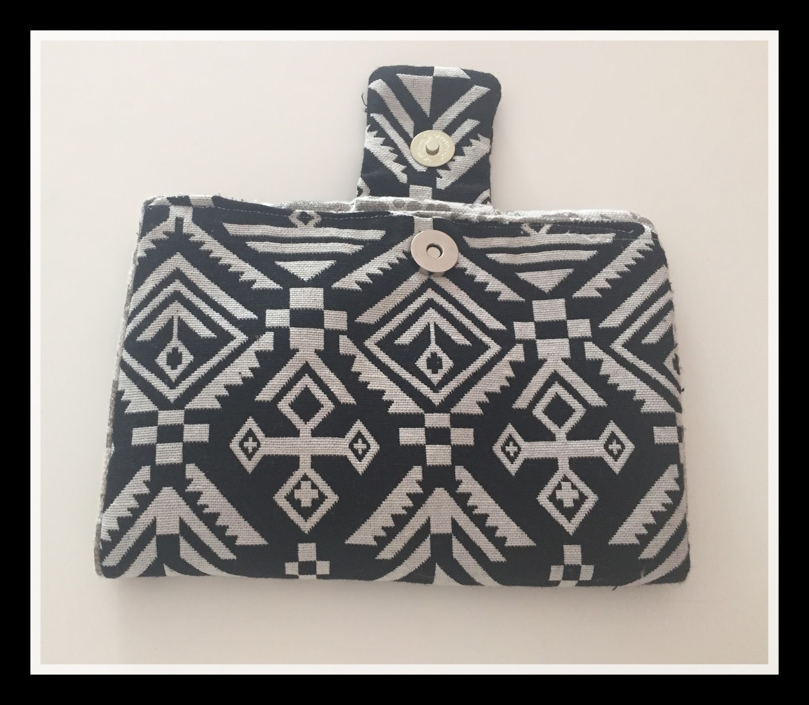 Así que esta con una tela oscura, como me gustaba tanto mi mochiLohn, he utilizado la misma tela para el exterior. La hice sin patrón y un poco sobre la marcha... últimamente tengo poco tiempo para coser y la quería para ya, no me entretuve mucho en pensar... seguí un poco el estilo de las que siempre tengo... grandota, tarjetero por un lado, espacio para los billetes y monedero por el otro; para el cierre esta vez botón de iman que últimamente lo pongo a todo pero es que me parece super práctico.
